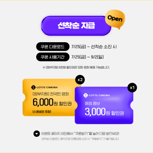 지금 바로 각 영화관 앱 또는 홈페이지에 접속해 6,000원 할인권을 발급받고, 올여름 문화생활을 제대로 즐겨보세요.